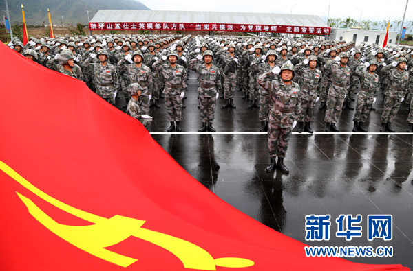 2015年胜利日大阅兵训练期间,“狼牙山五壮士”英模部队方队组织宣誓活动(2015年6月29日摄)。新华社发