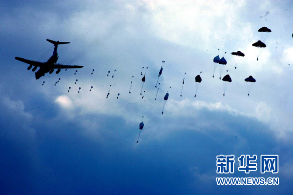 2005年8月24日,参加“和平使命-2005”中俄联合军事演习第三阶段两栖登陆作战实兵课目演练的中国空降兵部队在实施伞降。新华社记者 查春明 摄