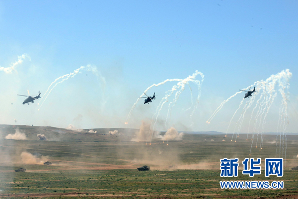 “和平使命-2014”联合军演中,原陆军第38集团军某红军团突击分队在陆航掩护下冲击目标阵地 (2014年8月26日摄)。新华社发
