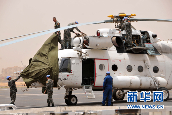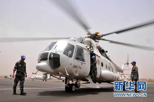 今年6月11日、12日,中国空运先遣组24人搭乘装载维和直升机的大型运输机,分两批次先后抵达喀土穆国际机场。据悉,首批直升机分队配备了4架中型多用途直升机,主要担负空中巡逻、战场侦察、人员输送、伤员转运、物资运输等任务。