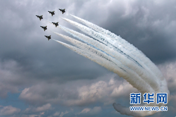 8月4日,中国空军八一飞行表演队亮相“航空飞镖”靶场开放日。新华社发(杨盼 摄)