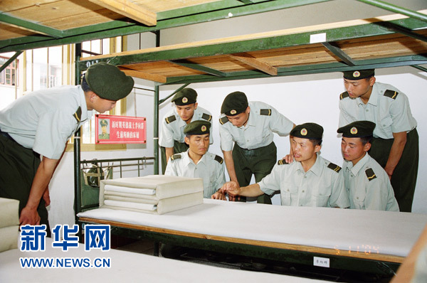 战士们在李向群的床铺前重温英雄的故事(资料图片)。新华社发
