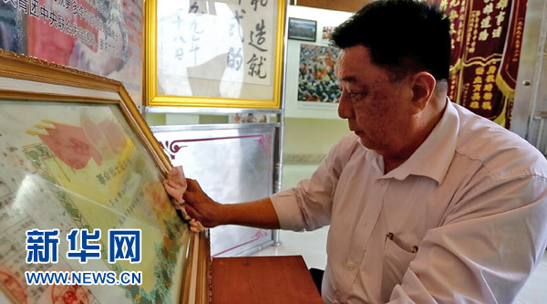 在海口市东山镇,李德清在家中擦拭儿子李向群的烈士证(2017年4月22日摄)。新华社发