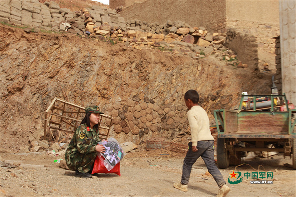 在外面玩耍的大多杰看到边防妈妈黄晓娟,忍不住小跑了过去。