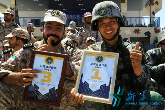 11日,“军械能手”修理排接力赛颁奖后,中国队员和伊朗队员合影。赵治国 摄