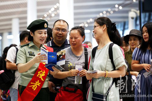 活动期间,该站在常州奔牛国际机场出境大厅张贴宣传海报、发放宣传画册、播放宣传视频,充分展示了该站近年来在提高边检服务水平、“法治边检”建设和执法规范化等方面取得的工作成效,并通过有奖知识竞答等互动方式,向广大出入境旅客赠送印有“边检天天”卡通宣传形象的遮阳帽、折扇、雨伞等纪念品,进一步普及边检出入境知识和政策法规。