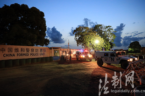 图为天色渐暗,中国维和警察防暴队巡逻组乘车驶出营区
