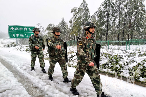 图为北极边防派出所官兵冒雪巡逻,防止外来游客及辖区群众发生险情
