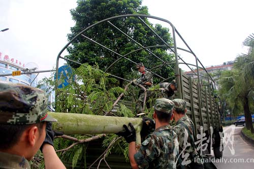 自8月23日开始,今年第13、14号台风“天鸽”、“帕卡”相继在广东沿海登陆。位于台风登陆途径的广东省江门市遭受了严重的破坏,市区道路两边大量树木被吹倒,甚至被连根拔起。为最大限度减少台风带来的损失,8月24日至8月28日,广东边防总队江门边检站官兵积极响应江门市委、市政府的号召,迅速动员部署,先后组织200余名官兵深入驻地受灾街道开展灾后清理工作,帮助群众重建家园,以实际行动践行全心全意为人民服务的宗旨,受到驻地党政职能部门和人民群众的一致好评。