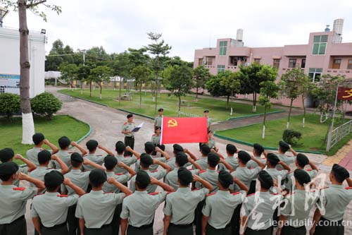 8月28日上午,广西边防总队北海边防支队机动大队42名临退老兵面对党旗再一次重温入伍誓词,感悟军人的忠诚与责任、边防战士的自豪与骄傲。