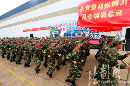 图为江苏边防总队后勤应急保障拉动演练队员在紧急集结