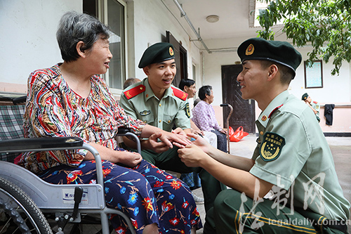 8月29日下午,江苏边防总队连云港边检站面临复退的战士最后一次穿着军装走进驻地敬老院,看望他们“认亲”的老人,送上他们退伍前的一声祝福,并将“认亲”的老人交到留队的战友手中,将这份爱心传递下去。据悉,这个站“认亲”的传统已经延续了27年,每名官兵都有“认亲”的孤寡老人,他们和老人之间建立了深厚的感情。(钱逸帆 王钰)