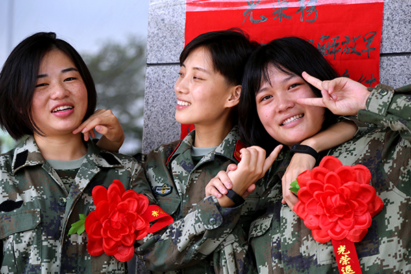 图为退伍女兵合影留念