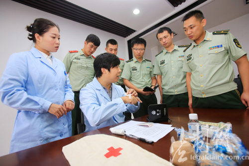图为医护人员在边防派出所为官兵讲解警用装备包中急救物品的使用方法及注意事项