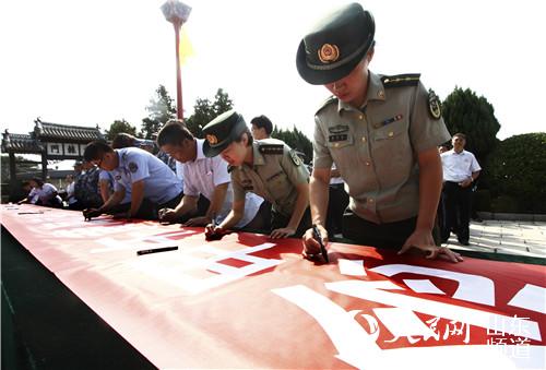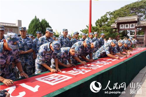 图为官兵现场在横幅上签名