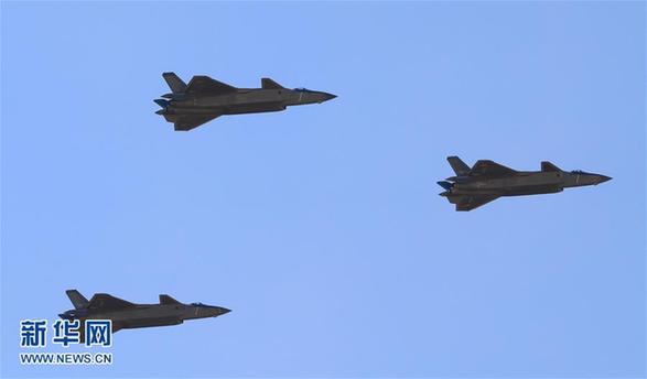 7月30日,庆祝中国人民解放军建军90周年阅兵在位于内蒙古的朱日和训练基地举行。这是歼击机梯队的歼-20战机。新华社记者 李刚 摄
