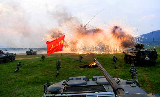 “杨根思连”官兵在演练中向前突击。王东辉/摄