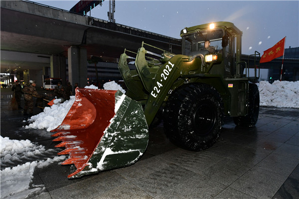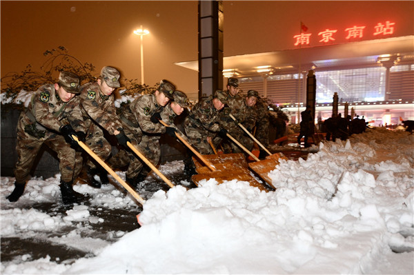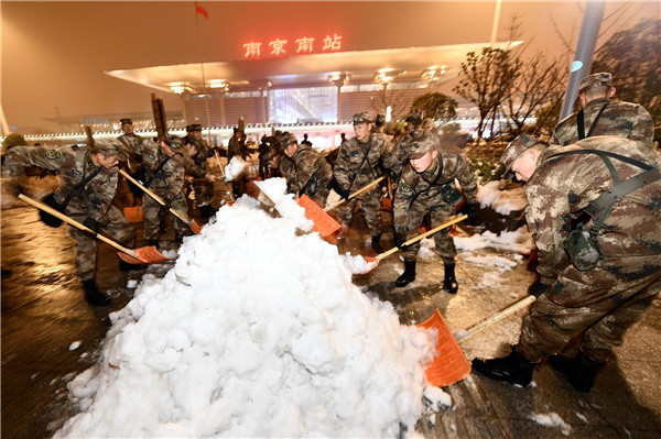 图为“临汾旅”官兵在南京南站北广场扫雪除冰。于同化 摄