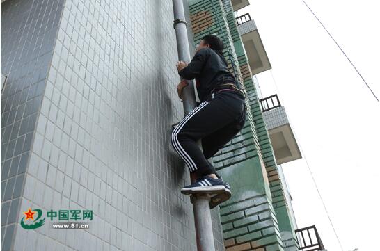 在征得同意后,我穿上保护装具,摩拳擦掌,开始像模像样地往上爬。一节,两节,三节,抱着只有小腿粗细的雨漏管,我越爬腿越软,直往下出溜。只爬了大概三层楼高,我就实在无力继续,只好败下阵来。队员告诉我,2005年,时任分队长刘洋曾在武警部队军事大比武中创造过攀爬五层阳台仅用时6秒07的纪录,至今无人打破!而从地面到三层,我大概用了半分多钟。相比之下,真是感觉自己弱爆了!