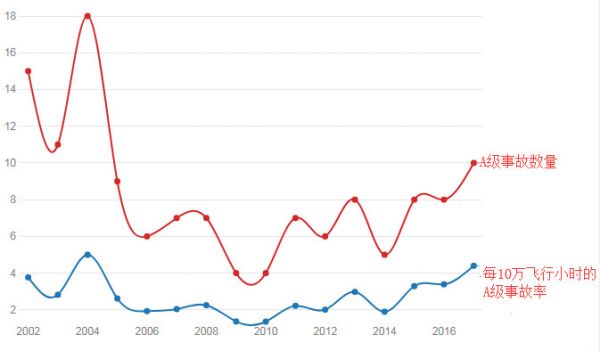 资料图片:美海军陆战队2002年到2017年的A级飞行事故数量及每10万飞行小时的A级事故率示意图。(图片来源于网络)