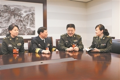 解放军报记者邵薇(右一)采访军队人大代表冯毅、曹新元、崔玉玲(右二至右四)。徐小龙摄