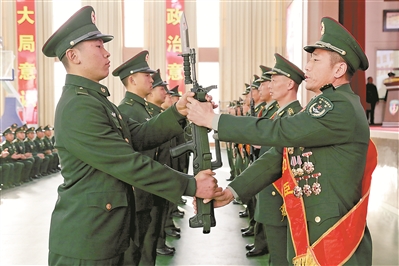 上图:第80集团军某特战旅举行仪式,由10名一等功臣为完成入伍训练的新战士授枪,激发强军精武热情。(陈豪、王健、马亚超)