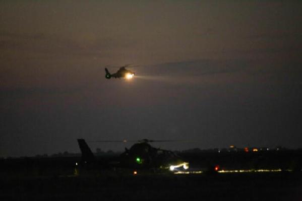 夜间,多架多型号武装直升机带弹起飞(4月18日摄)。