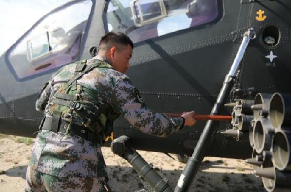 军械员在为新型武装直升机装弹(4月18日摄)。