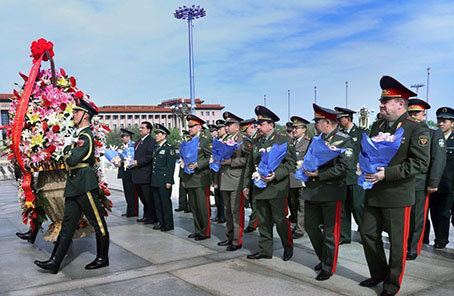 4月24日,上海合作组织多国国防部长在北京向人民英雄纪念碑敬献花篮。 中新社记者 宋吉河 摄