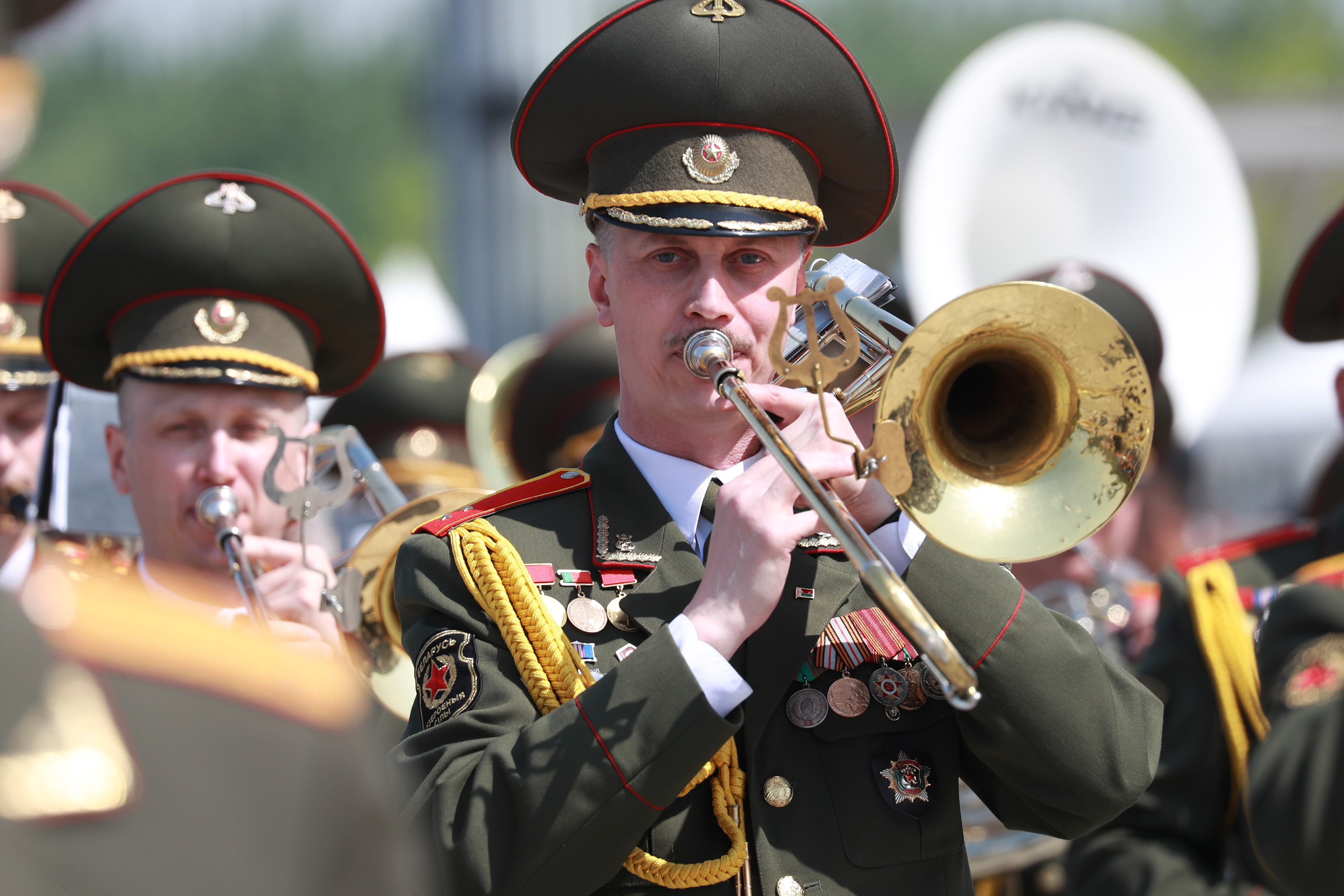 4月25日,白俄罗斯共和国武装力量模范演出军乐团进行军乐巡游表演。新华社记者琚振华 摄