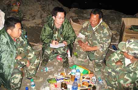 王玉山(左二)在唐家山堰塞湖堰顶上采访武警水电官兵