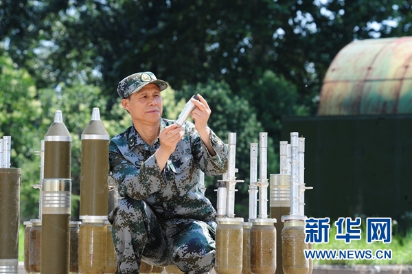 中国工程院院士、军事科学院国防工程研究院研究员任辉启检查弹体作用情况(资料照片)。 新华社发(侯艺兵 摄)