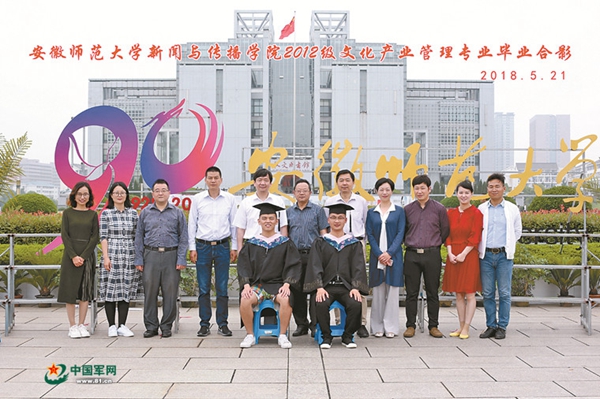 5月21日,安徽师范大学新闻与传播学院组织应届毕业生拍摄毕业照,众多班级的学生依次排队拍摄,其中一个班级与众不同——只有两名学生,而与他俩合影的却有11名老师。并且,11名老师站在后排,两名学生坐在前排。当相机的快门摁下之后,这张照片成为该校浓厚尊崇军人氛围的亮丽名片。