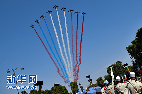 7月14日,在法国巴黎举行的国庆阅兵仪式上,“法兰西巡逻兵”飞行表演队飞过香榭丽舍大街。新华社记者 陈益宸 摄