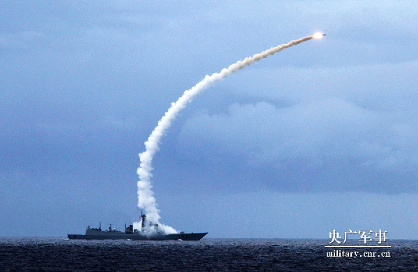 2010年7月26日,海口舰参加实弹演习,图为海口舰发射舰空导弹拦截来袭目标
