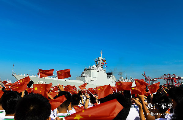 2018年5月16日,海口舰访问命名城市海口市,市民挥舞国旗热烈欢迎