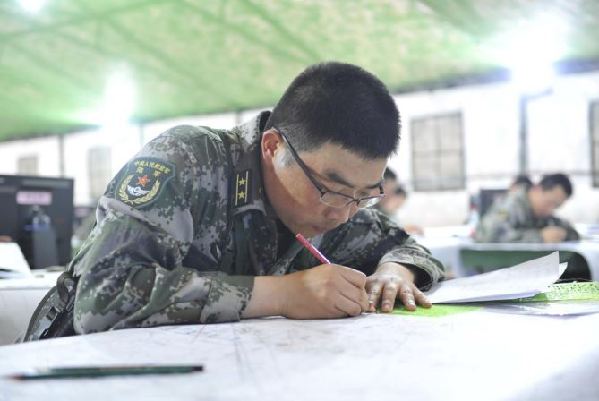 5月11日,第81集团军某防空旅突出“真、难、严、实”组织第二季度首长机关军事技能考核。这是该旅机关干部正进行指挥综合作业标绘首长作战决心图。杨兴灿 摄