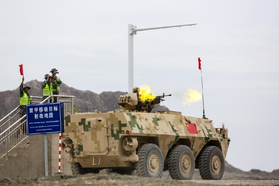 7月31日,参赛的中国车组使用高射机枪射击移动装甲目标。新华社记者 黎云 摄