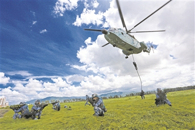 海军陆战队某旅官兵进行直升机滑降训练。关亚斐 摄