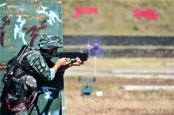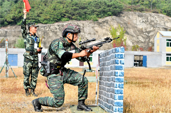 9月28日,在个人全能课目中,一名参赛队员利用拐角枪进行射击。新华社发(曹峰摄)