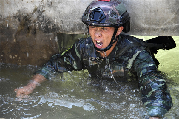 更多的参赛队员在比武中拼了命。来自武警云南总队的茶绍龙是个人全能课目首个“吃螃蟹”的队员,这个课目要求队员在5公里复杂地形上,90分钟内完成多种武器操作、驾驶射击、手榴弹投掷、越障、武装泅渡等10项险难内容。