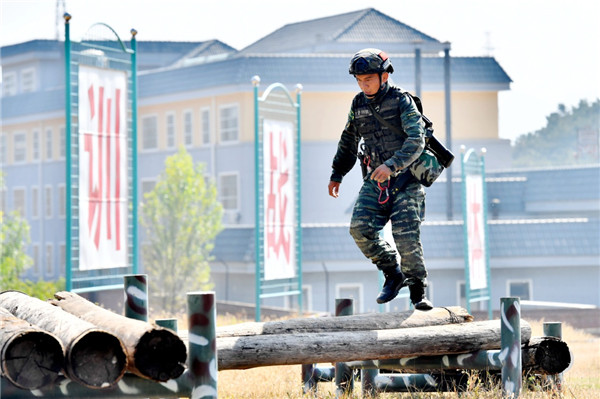 9月28日,在个人全能课目中,一名参赛队员快速通过Z型桥。新华社发(李涛摄)