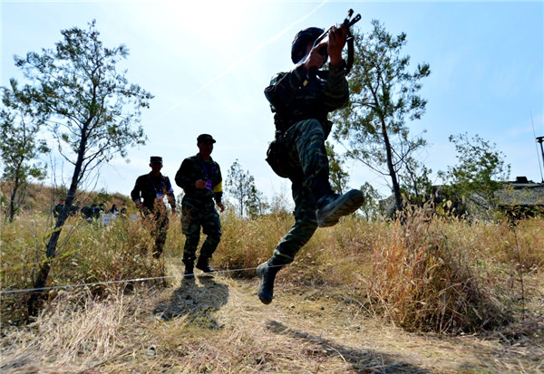 9月25日,在搜索识别射击课目中,一名参赛队员快速躲避“绊发爆炸装置”。新华社发(曹峰摄)