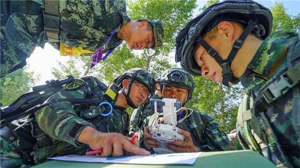 9月25日,在特战小队武装营救人质课目中,参赛队员利用无人机对残图进行恢复。新华社发(李涛摄)