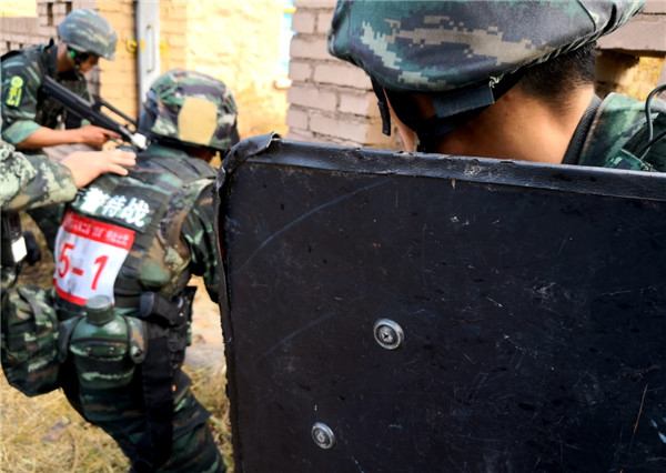 9月28日,在特战小队武装营救人质课目中,参赛队员准备对屋内“恐怖分子”实施武力突击。新华社记者刘新 摄