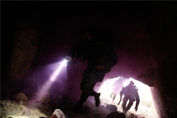 9月27日,在特战小队武装营救人质课目中,参赛队员穿越“染毒”山洞。新华社发(王涛摄)