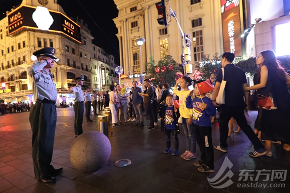 10月4日晚上20时30分,在南京东路与湖北路交叉口,武警上海总队执勤五支队官兵正在疏导游客,突然手持国旗的3名小朋友走到执勤官兵面前,朝着执勤的战士敬了个礼,并向执勤的战士说:“叔叔,您辛苦了。”随后,执勤的战士也向3位小朋友回敬了一个军礼。这温馨的一幕,被网友用手机拍照记录,发到微信朋友圈中,感动了不少人。