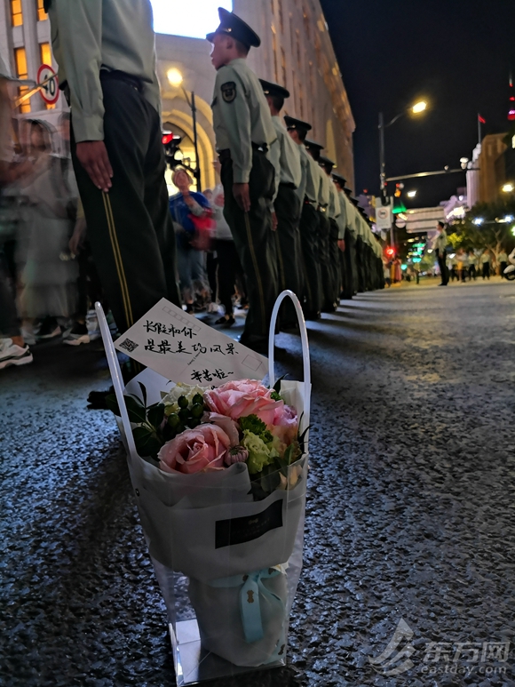 10月4日晚21时10分,在南京路步行街十字路口,一位姑娘手捧鲜花走执勤官兵面前:“辛苦你们,这束花送给你们!”放下转身便消失在人群之中。当执勤官兵拿起鲜花时惊喜地发现,里面还夹了一张特制的明信片,娟秀的字迹写到:“长假和你,是最美丽的风景。辛苦啦~比心~”