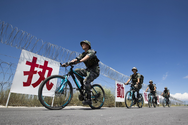 新疆军区霍尔果斯边防连官兵骑自行车在边境线上巡逻(7月26日摄)。新华社记者 琚振华 摄
