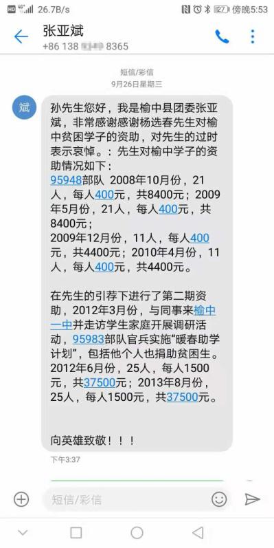 新华社兰州11月1日电(彭晋东、李燕京)9月26日,一条短信发到空军某试验训练基地某部孙亮的手机上。“孙先生您好,我是榆中县团委张亚斌,非常感谢杨选春先生对榆中贫困学子的资助,对先生的过时(世)表示哀悼。先生对榆中学子的资助情况如下……”